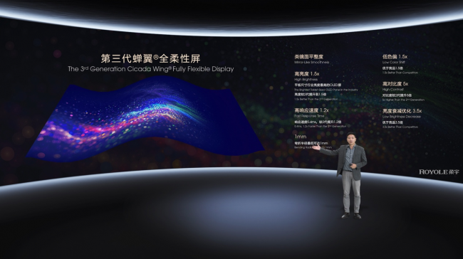 此外,基于自主研发的智能显示芯片与电路,柔宇第三代蝉翼全柔性屏亮度较前代产品提升了1.5倍,响应速度提升1.2倍达到了0.4ms,对比度提升了5倍。和同类产品相比,第三代蝉翼全柔性屏低色偏表现有着1.5倍的提升,亮度衰减要比竞品强3.5倍。