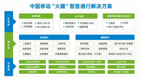 中国移动“火瞳”智慧通行解决方案,以AI智能识别技术、图片流管理及通用应用平台为核心,以智能硬件为载体,为政企园区、楼宇、教育、酒店、社区等场景提供集“刷脸通行、刷脸考勤、刷脸访客、刷脸消费、刷脸测温、人脸布控、车辆通行”等多种应用场景于一体的全场景AI“一脸通行”解决方案。