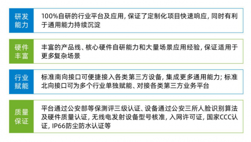 同时,平台还提供了丰富的标准南北向接口,一方面通过标准南向接口可以快速接入三方的智能识别设备,另一方面通过标准的北向接口为大园区、大社区、ERP等三方业务平台快速赋能。