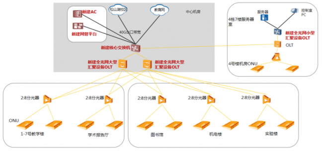 经过数月的持续改造,学校莞城校区网络基础设施建设一期目标已圆满完成,两层架构下光纤从学校的核心机房直接连接到教室、实验室等,大大节省了机房和布线,同时汇聚层无源设备,实现了免取电,免弱电机房,免运维,减少故障点并提高系统可靠性。