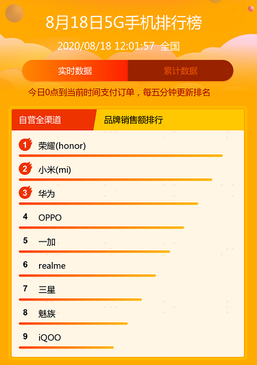 众所周知,此前国内5G手机完全是以华为为首的国产手机的天下。8月18日0-12点的苏宁易购悟空榜5G销量榜半日战报数据显示,除了三星,其他9个席位全部被国产5G手机占领。而最新的苏宁易购大数据也显示,在8月7日-9月6日期间,国内5G手机销量前五名被华为、荣耀、小米和OV瓜分。