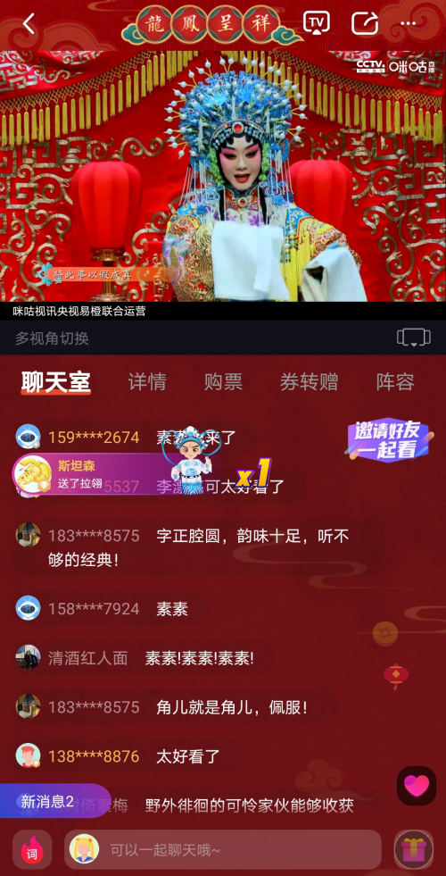 开播当晚,相关话题#龙凤呈祥云端相见#随即登上微博热搜,来自全球各地的观众通过咪咕视频、咪咕音乐、咪咕圈圈、咪咕海外平台(Migu C)、中国移动魔百和(北京地区)、腾讯视频、哔哩哔哩、喜马拉雅等平台线上观看,观看人数远超出线下演出可容纳的观众数量。据悉,这场《龙凤呈祥》不仅是将线下演出“搬到”线上,还以5G+4K超高清直播、多视角、“云包厢”、“云打赏”等黑科技为国粹京剧注入时代新活力,通过沉浸式体验与花式互动玩法“圈粉”Z世代群体,满足他们多样化、个性化、高品质的观戏需求。值得一提的是,在“就地过年”的大背景下,《龙凤呈祥》云演播还以“云包厢”技术,为“原年人”打造网络专属空间与欢聚时刻,跨越距离实现“云团圆”。