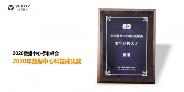 同时在本次大会上,维谛技术(Vertiv)有限公司服务产品部高级总监曹播还荣获了由中国工程建设标准化协会颁发的“2020数据中心科技成果奖--青年科技人才”奖。