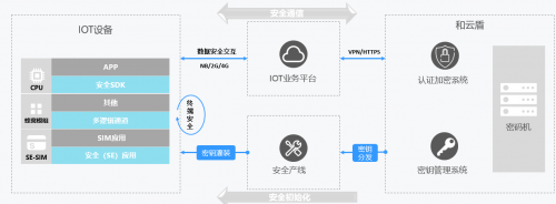 产品主要由端侧的安全芯片和云测的和云盾两部分组成,采用主流的国际密码算法和国密算法(SM2/SM4/SM9),通过了国家密码管理局商用密码检测中心的国密二级认证,中国网络安全审查技术与认证中心的EAL4+认证,达到金融级别的安全防护能力。
