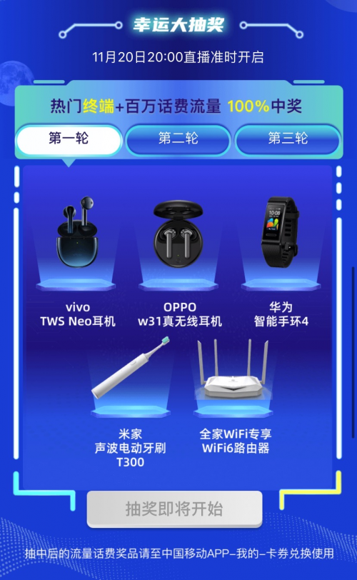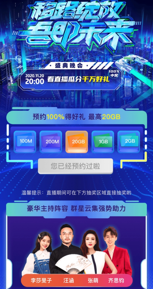 20号晚上的中国移动20周年合作晚会更是壕得“任性”了,不仅将在直播时放送千万好礼,还给线上平台预约的小伙伴送起了流量,人人有份,最高可得20GB!直播期间,也别忘了在线上平台参与抽奖,或许那个“幸运鹅”就是你。话不多说,拥有5G网速的小编已经预约完毕。