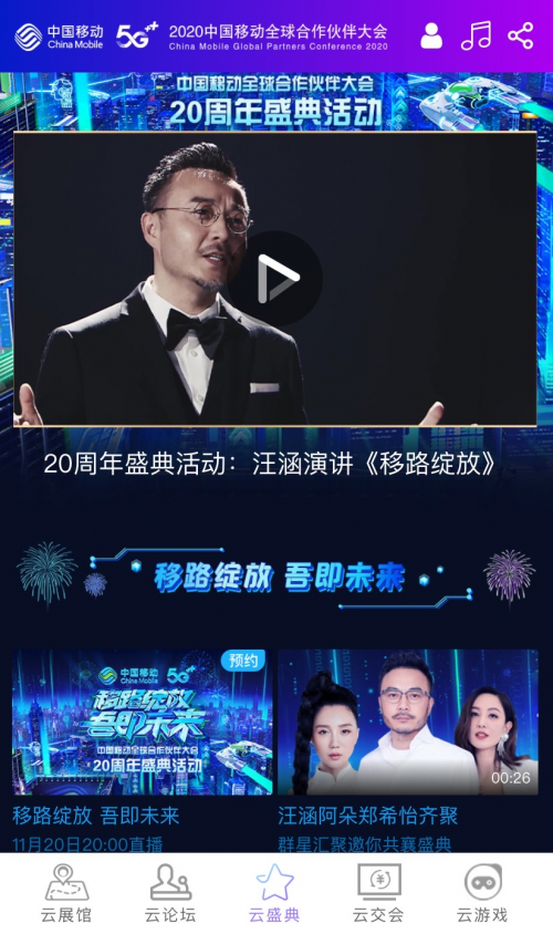 逛展逛累了,不妨来云盛典板块浸享一场视听盛宴。移动20周年盛典演出、金鸡百花等精选特色内容都在这里,有明星,有听觉福利,更有不一样的精彩!包含众多高品质手游的云游戏板块,不用下载就可以流畅任玩,是不是也很给力?对了,还可以在云交会板块疯狂血拼,享受一下便捷的云购物体验~
