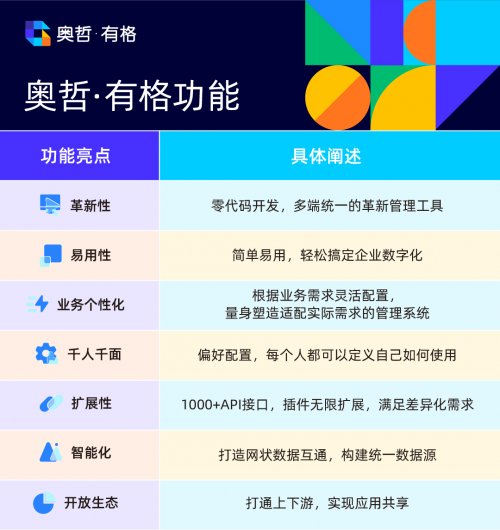 有格的名称来源于“言有物,行有格”,意味着奥哲帮助企业实现数字化不只是一个口号。企业数字化不只是IT部门的职责,而应该是企业中每一个人的共同追求,而有格则是企业让每一个人实现数字化升级的最佳选择。
