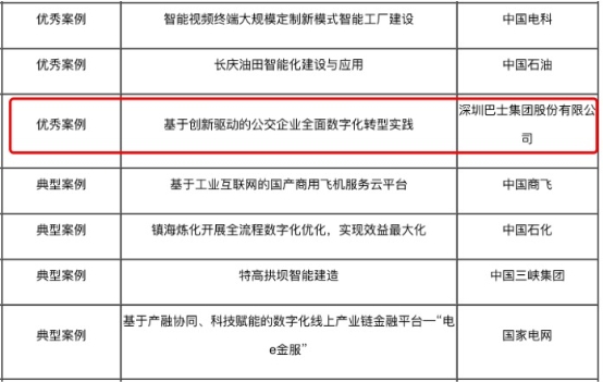 在2020年国务院国资委国有企业数字化转型典型案例征集中,由深圳巴士集团组织申报的《基于创新驱动的公交企业全面数字化转型实践》荣获最高奖项——优秀案例;在2020全国企业管理现代化创新成果评选中,由深圳巴士集团组织申报的《公交企业基于数字化技术的智慧出行服务管理》荣获全国企业管理现代化创新成果一等奖,成为全国唯一获此两项殊荣的公交企业。